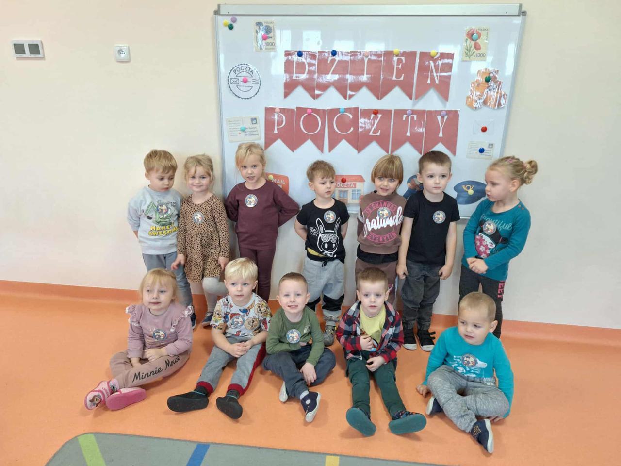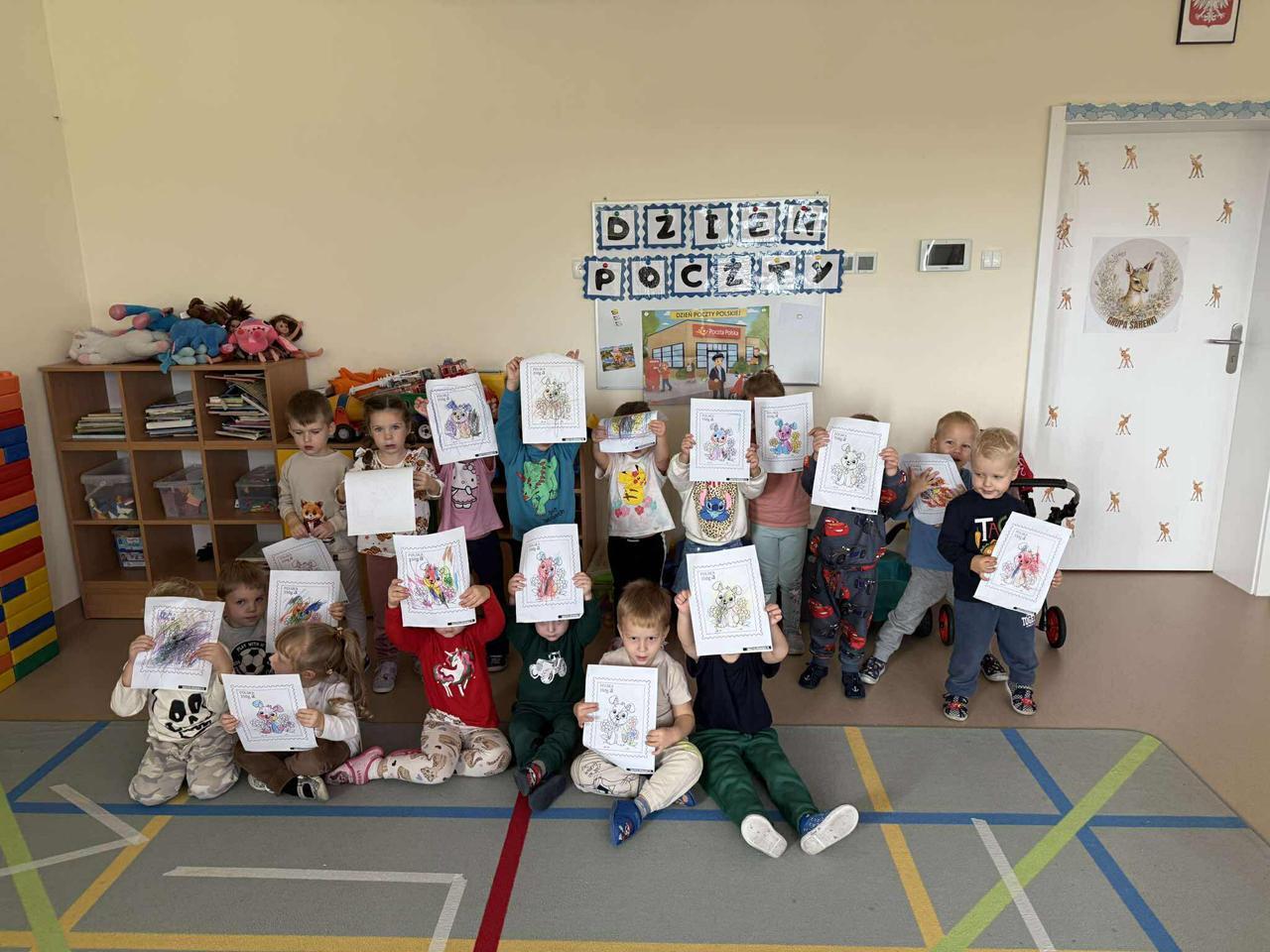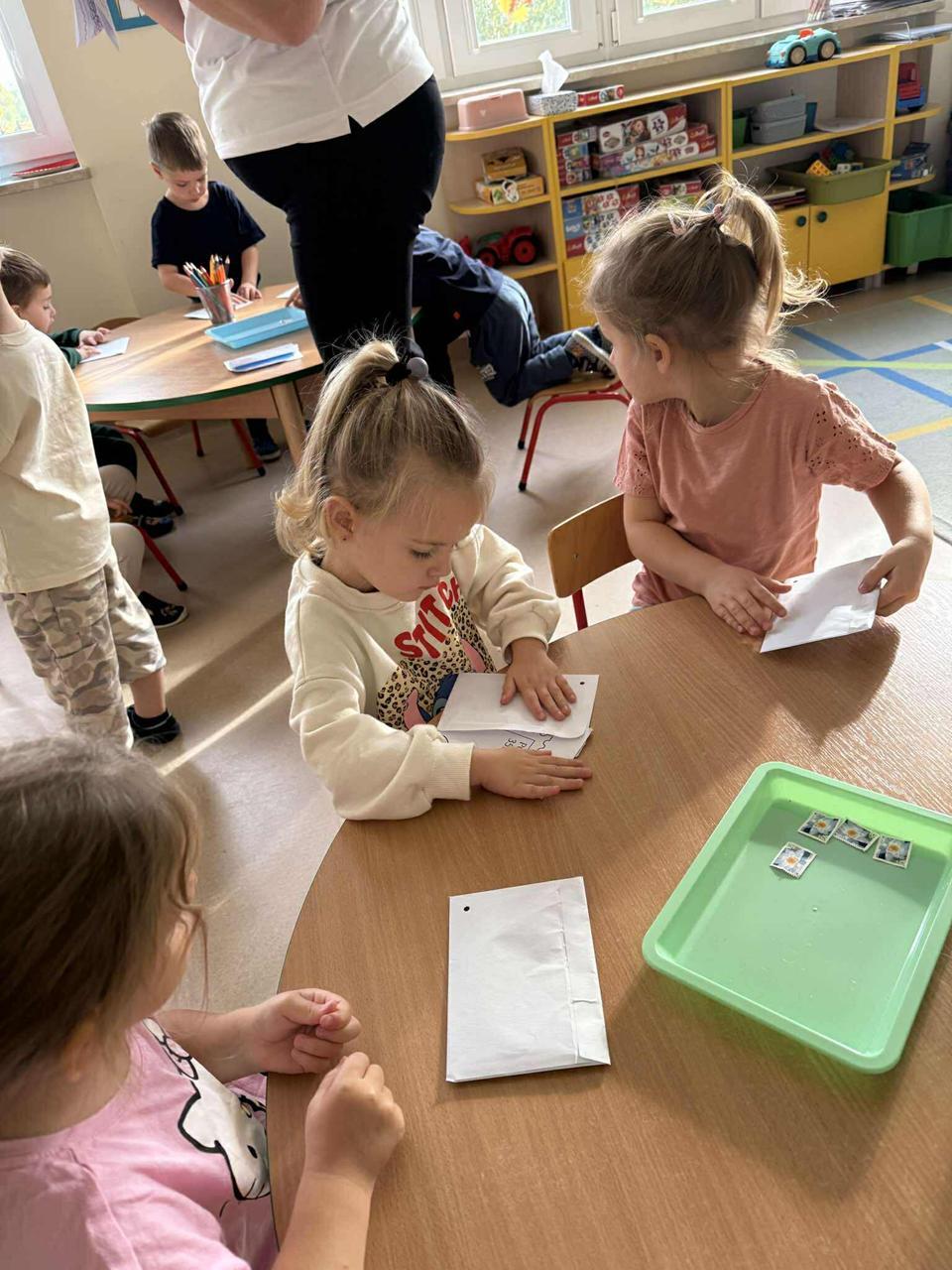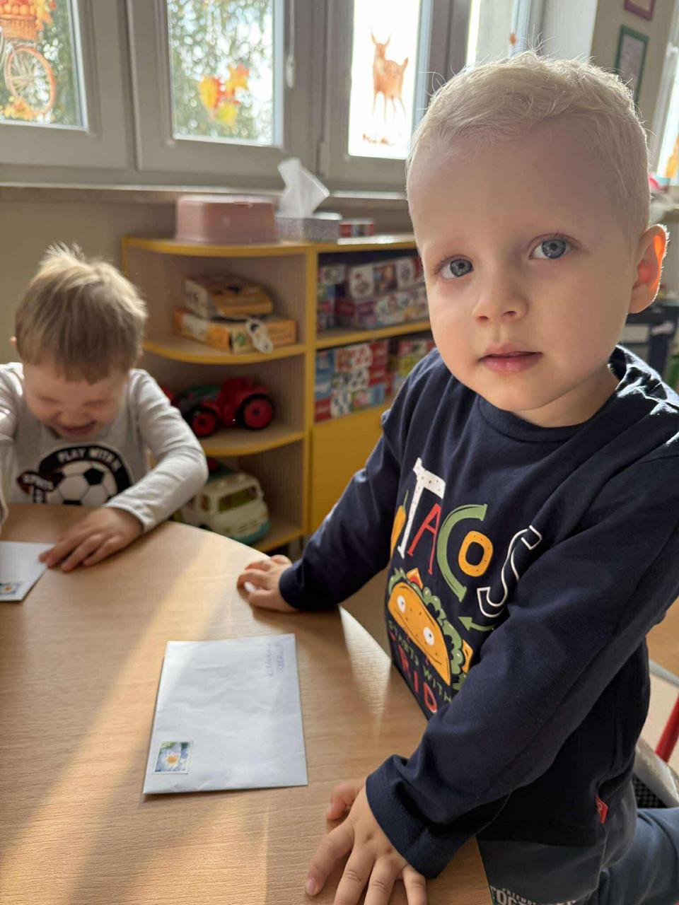 Nasze najmłodsze przedszkolaki odkrywały tajemnice poczty — dowiedziały się, czym jest list, koperta, znaczek pocztowy i pocztówka. Dzieci z zaciekawieniem odgadywały, co może kryć się w przesyłkach, bawiły się w małych listonoszy, grały w pocztowe domino, a także szukały odpowiednich wzorów na kółkach i przypinały do nich klamerki. Na zakończenie stworzyły własne prace plastyczne, które zapakowały w koperty i ozdobiły znaczkami. To był dzień pełen uśmiechu i nowych odkryć!