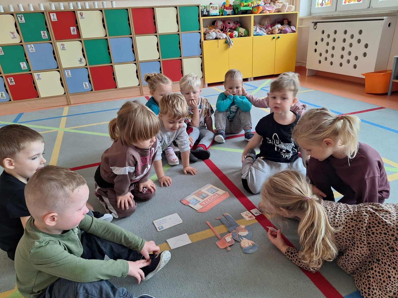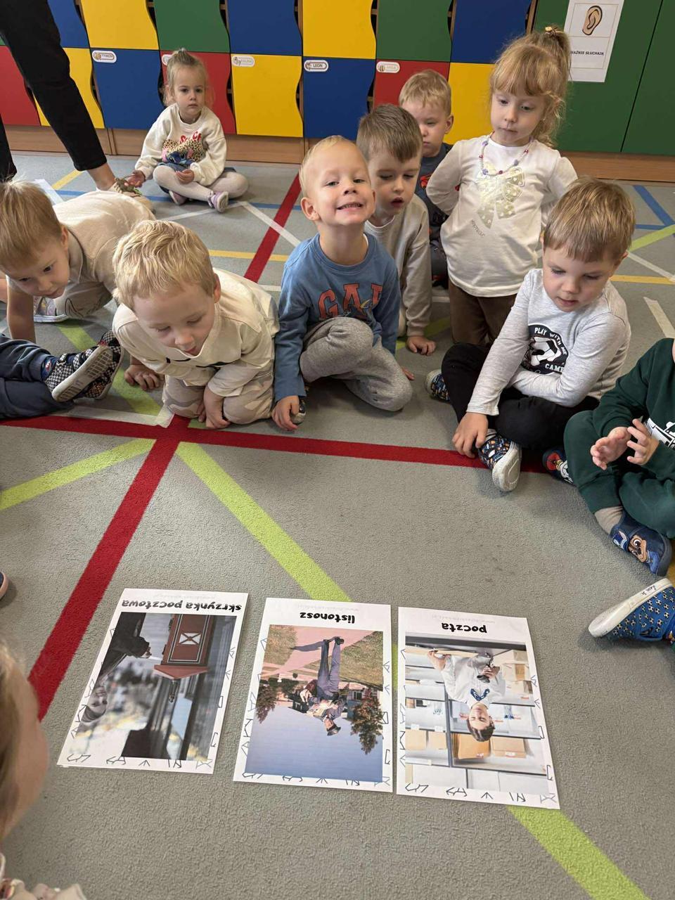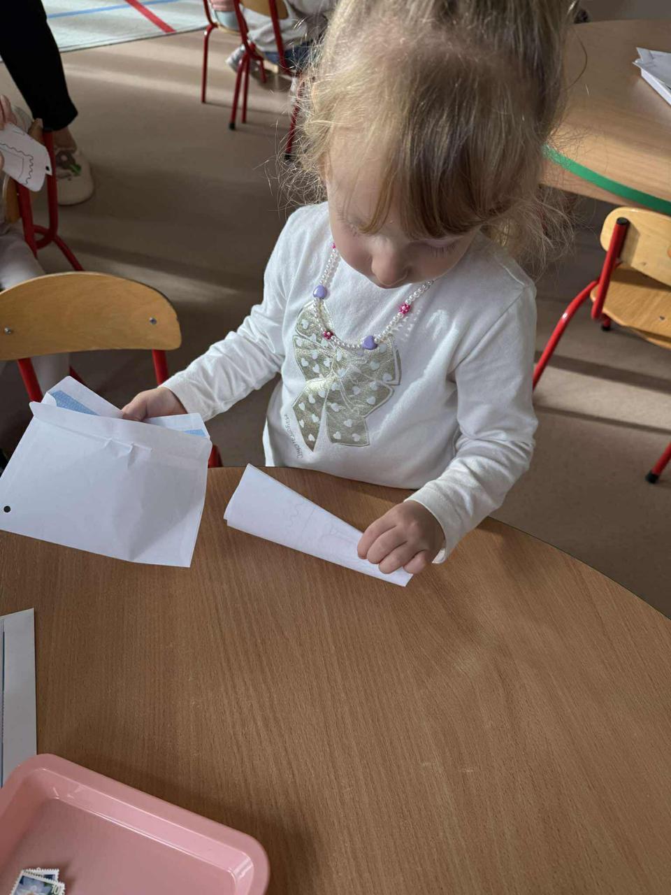 Nasze najmłodsze przedszkolaki odkrywały tajemnice poczty — dowiedziały się, czym jest list, koperta, znaczek pocztowy i pocztówka. Dzieci z zaciekawieniem odgadywały, co może kryć się w przesyłkach, bawiły się w małych listonoszy, grały w pocztowe domino, a także szukały odpowiednich wzorów na kółkach i przypinały do nich klamerki. Na zakończenie stworzyły własne prace plastyczne, które zapakowały w koperty i ozdobiły znaczkami. To był dzień pełen uśmiechu i nowych odkryć!