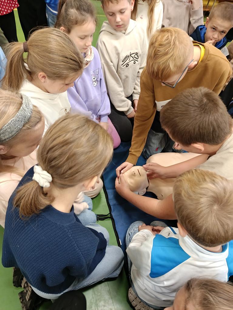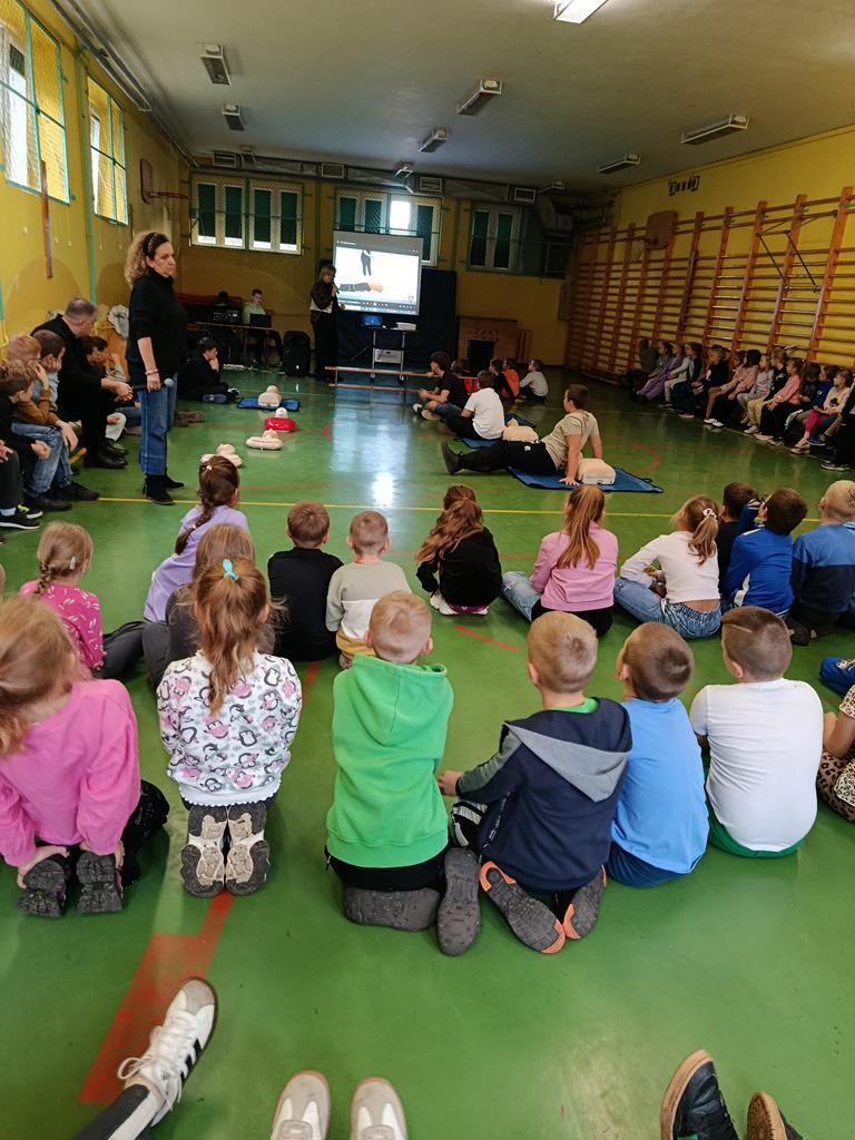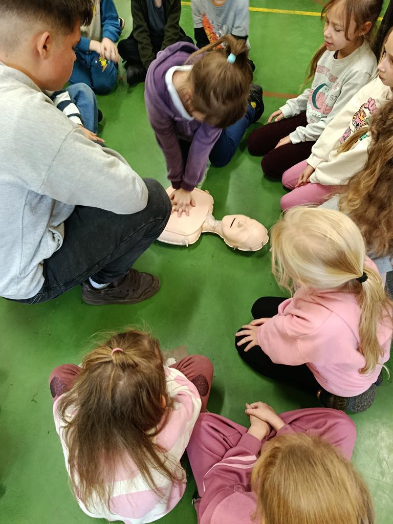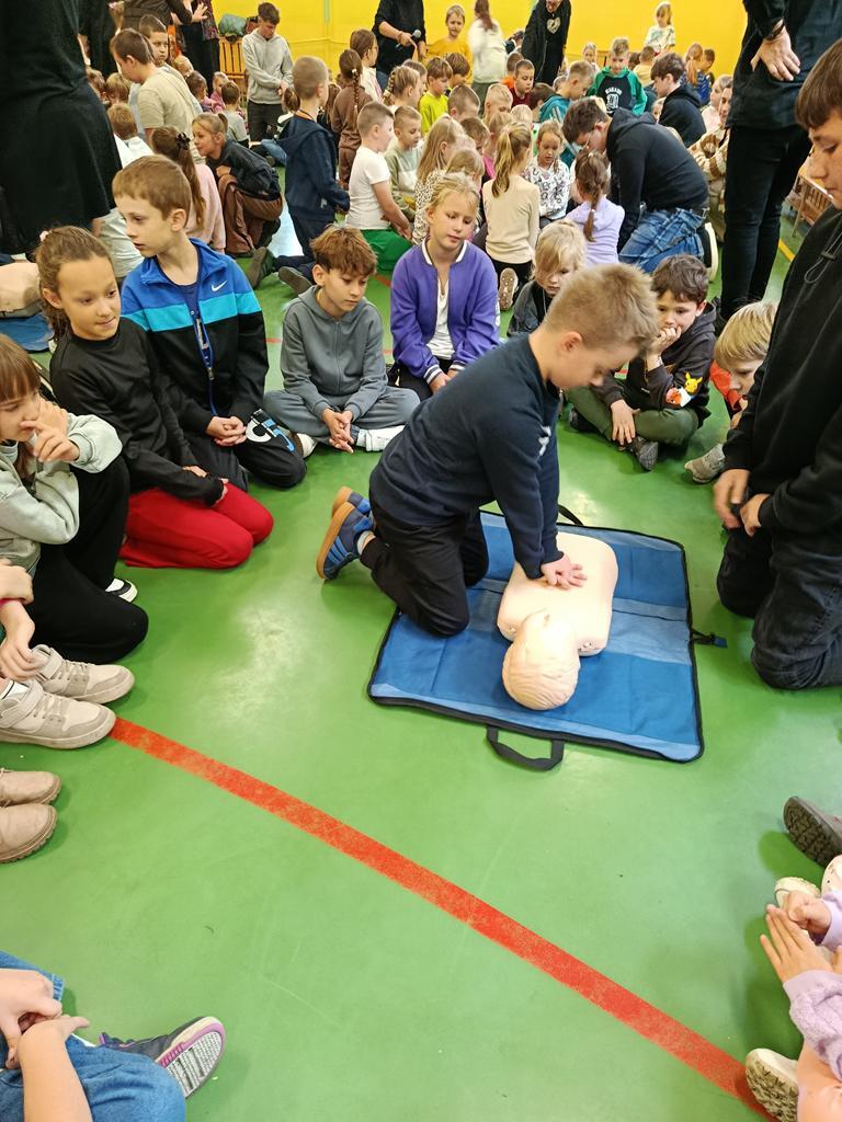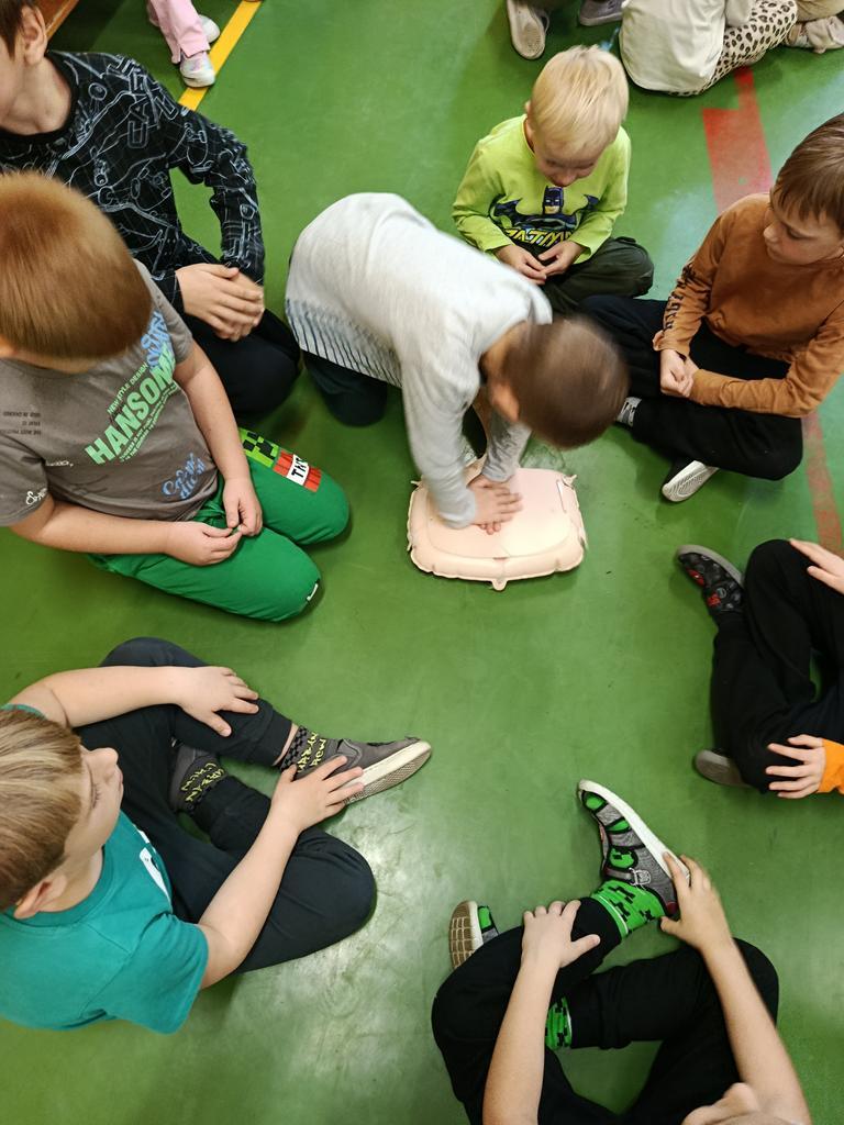 W czwartek 16 października uczniowie brali udział w akcji bicia rekordu w pierwszej pomocy w ramach Programu Edukacyjnego „Ratujemy i Uczymy Ratować”. Głównym celem wydarzenia jest popularyzacja wiedzy na temat udzielania pierwszej pomocy, a zwłaszcza resuscytacji krążeniowo-oddechowej. Podczas spotkania zostały przypomniane zasady dotyczące RKO, a następnie rozpoczęto ćwiczenia praktyczne z wykorzystaniem fantomów. W tym roku do akcji przyłączyły się sześciolatki, które od swoich starszych kolegów i koleżanek uczyły się zasad udzielania pierwszej pomocy.