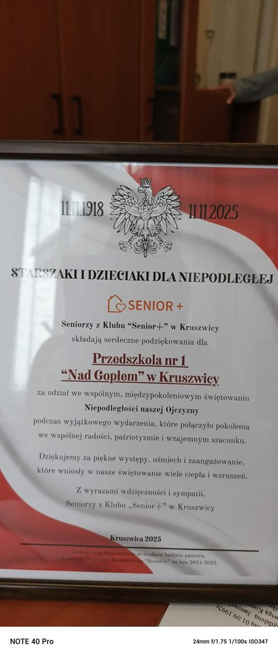 12.11.2025 przedszkolaki z grupy Lisków wzięły udział w wydarzeniu "Starszaki i Dzieciaki dla Niepodległej" w Kubie Senior+ w Kruszwicy. Dzieci zaprezentowały piosenkę "Jesteśmy Polką i Polakiem" oraz wiersz "Katechizm polskiego dziecka" Władysława Bełzy, który uczy najmłodszych o polskiej tożsamości narodowej, symbolach i obowiązkach. To wydarzenie połączyło pokolenia, dając wiele radości i wspólnego szacunku oraz wzmacniając postawę patriotyczną.